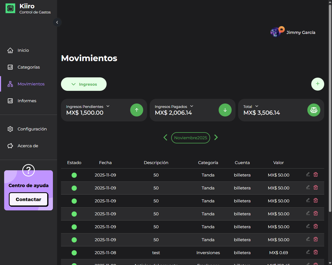 Kiiro App es una aplicación web moderna para gestionar gastos personales, desarrollada con React, Supabase y Vite. Incluye funciones como modo oscuro y claro, reportes interactivos, manejo de categorías y almacenamiento seguro en la nube. Su diseño está inspirado en una experiencia minimalista y profesional.